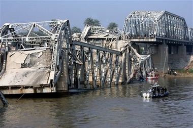 巴格达警方透露,开着卡车的自杀袭击者在桥中央引爆炸弹,钢铁结构的大桥瞬间被炸毁,桥墩垮塌。警方认为,桥的两端均被毁坏,证明至少有两个袭击者。这座铁桥由英国军队在1946年建造,质量还算可以。据悉,因为安全原因底格里斯河上的多数桥梁已被封锁,不准车辆通行。