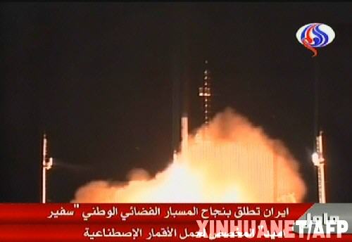 图为这是8月17日伊朗一家电视台播放的伊朗首颗自行研制的人造卫星发射升空的电视截图。伊朗军方宣布,伊朗当天成功发射“使者”号火箭,并将一颗名为“希望”的自制人造卫星送上太空。 新华社/法新