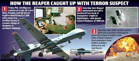 据英国媒体11月25日报道,美国军队22日曾对巴基斯坦西北部落地区发动导弹袭击,并使得包括英籍恐怖头目拉希德-拉乌夫在内的至少5名恐怖分子死亡。美军最新披露的消息显示,驻阿美军当天是在得到准确的地面情报后,远程遥控一架正在附近巡逻的无人机前往发动袭击的。