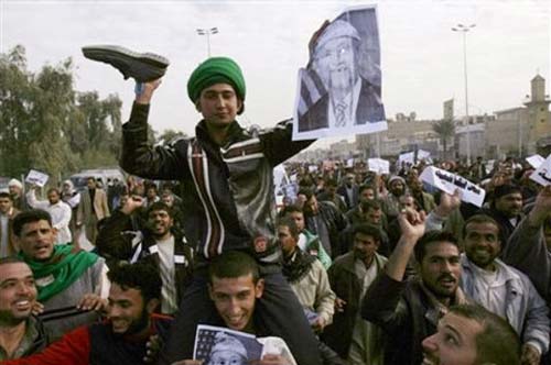 纳杰夫地区的一名示威者用鞋子拍打美国总统布什的画像。