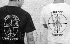 中新网3月24日电 据日本共同社报道,以色列《国土报》日前称,以军士兵中最近流行穿一种原创T恤,T恤上印着漠视巴勒斯坦人生命的图案和文字,例如将瞄准器对准阿拉伯孕妇,并配上“一枪杀两人”的文字。