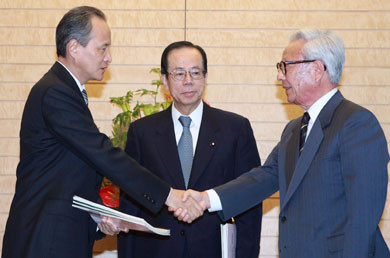 中新网6月12日电 据中国外交部网站消息,6月12日,日本兵库县前知事、纪念兵库震灾21世纪研究机构理事长贝原俊民在日本首相官邸向中方赠送了阪神地震灾后重建资料。日本首相福田康夫、中国驻日本大使崔天凯等出席赠送仪式。