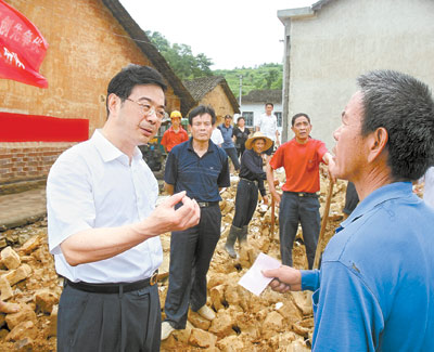 在一处废墟上,村里的党员干部正带领村民们帮助倒房户清理倒塌的房屋。周强走到大伙中间,同大家详细交谈,充分肯定农村基层党支部和广大党员在抗洪抢险和灾后重建中发挥的突出作用,同大家一道商量如何带领受灾群众,尽快开展灾后重建、救灾补损。一位老支书说,村里水利基础设施在洪水中损毁严重,这一块应该是灾后重建的重点。周强立刻接过话头说,我们想到一块了。