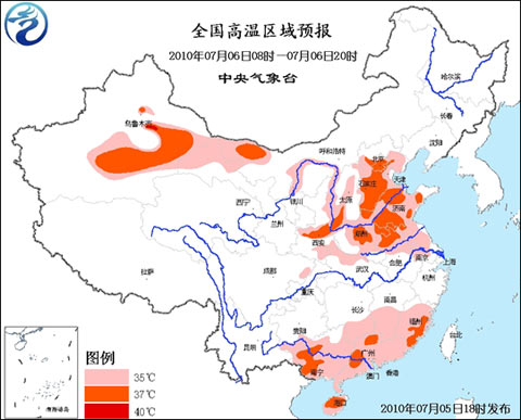 预计,明天白天,甘肃西北部、内蒙古中西部的部分地区、陕西东部和南部、山西中部和西南部、华北大部、黄淮大部、湖北西北部、江淮东部、湖南南部、江西南部、华南大部等地有35~37℃,北京、河北中南部、山东北部等地的部分地区有38~40℃的高温天气。