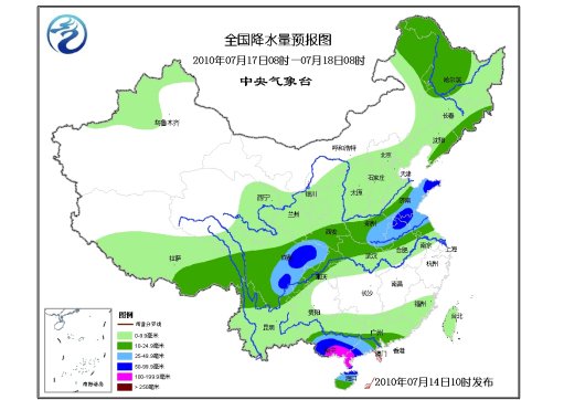 中新网7月14日电 据中央气象台预报,未来10天,降雨区范围较广,雨带位置不稳定;江南中南部、华南北部多高温少雨天气;西北地区东部、华北、黄淮、东北多阵性降雨。14日,江南东北部仍将有较大降雨;之后,雨区北抬到淮河流域;江南北部将转为高温少雨天气。17日前后,1002号热带风暴“康森”将影响华南沿海。