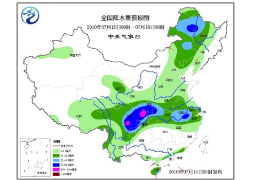 15日08时至16日08时,新疆天山西部、青海南部和东部、西藏中东部、甘肃中东部、宁夏南部、陕西大部、内蒙古中东部、东北地区中西部、华北、黄淮大部、江淮、江汉、江南北部、华南南部、四川、重庆、云南大部及贵州北部有小到中雨或阵雨,其中,陕西南部、四川中东部、重庆西部和北部、湖北西北部和东部、安徽中南部、江西北部、内蒙古东部、黑龙江西部等地的部分地区有大雨或暴雨,四川盆地局部有大暴雨;上述局部地区并伴有短时雷雨大风等强对流天气。新疆北部、内蒙古中东部、东北地区等地有4~6级风。南海中北部有6~8级大风;“康森”中心经过附近海面的风力可达9~11级;南海南部有5~7级西南风。