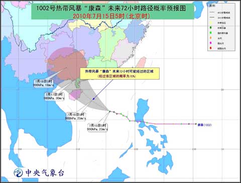 预计,“康森”将以每小时20公里左右的速度继续向西偏北方向移动,强度将有所加强,并逐渐向海南陵水到广东阳江一带沿海靠近,将于16日下午到17日凌晨在这一带沿海登陆。