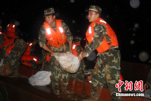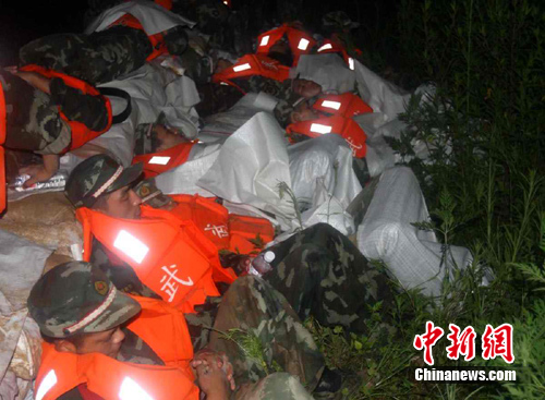 中新网九江7月16日电(张见悦 何柳斌 胡国林)赣东北地区遭遇今年以来最大洪水,长江干流江西段、鄱阳湖水位连续4天超出警戒线,汛情吃紧,5000余名武警战士、消防官兵夜宿江边,守卫大堤安全。