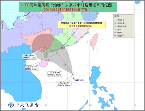 位于南海中部的热带低压于19日晚上加强为今年第3号热带风暴“灿都”,20日5时风暴中心位于广东阳江东南方大约720公里的海面上,就是北纬16.7度,东经116.2度,中心附近最大风力有8级(18米/秒),中心最低气压为1000百帕。