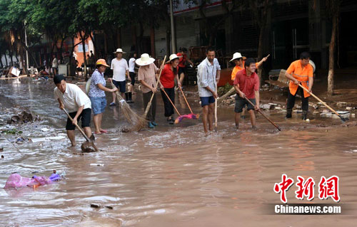 中新网广安7月20日电(廖小兵 李勇) 20日凌晨,四川广安城区160年难遇的洪峰慢慢消退,洪水过后,城区的清淤、防疫、灾后安置成了当前抗洪工作的重中之重。当地迅速组织机关干部、公安、消防、武警、志愿者以及受灾群众近万人迅速投入到清理淤泥、防疫工作当中,争取早日恢复往日的生活秩序。