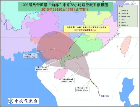 中新网7月20日电 据中央气象台网站消息,中央气象台7月20日18时继续发布台风蓝色预警:今年第3号热带风暴“灿都”的中心,20日17时位于广东阳江东南方大约510公里的海面上,就是北纬18.2度,东经114.9度,中心附近最大风力有9级(23米/秒),中心最低气压为990百帕。