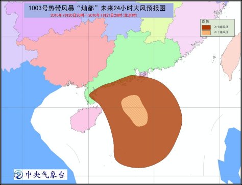 受其影响,20日晚上到21日白天,南海中部和北部及广东沿海、海南东部沿海的风力将有7-8级,“灿都”中心经过的附近海面的风力可达9-11级,部分海域和地区阵风可达12级。广东中部沿海地区将有大雨。