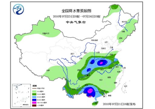 23日20时至24日20时,新疆北部、西藏东部、内蒙古东北部、东北中东部及秦岭、淮河以南大部地区有小到中雨或阵雨,其中,四川盆地东部、陕西南部、湖北北部、河南大部、安徽北部、江苏北部、云南南部、贵州南部、广西大部、广东西南部、海南北部等地有大到暴雨,局地有大暴雨;上述地区局地并伴有短时雷雨大风等强对流天气。新疆中部、内蒙古西部等地有4~6级风。北部湾有6~7级风,台湾海峡有5~7级偏南风。