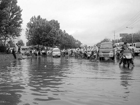 到了万芳广场前,路面积水深达半个车轮,一些马力不够的小轿车不敢再开,或停在路边等候,或钻进小胡同,只有大货、吉普敢一试深浅。在四台子检车线附近,向北车辆在此被分流。本报采访车苦行近2个小时,终于到达堵车源头——公铁桥。