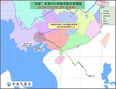 今年第3号热带风暴“灿都”(CHANTHU)于7月23日傍晚在广西西部减弱为热带低压,23日20时中央气象台对其停止编报。