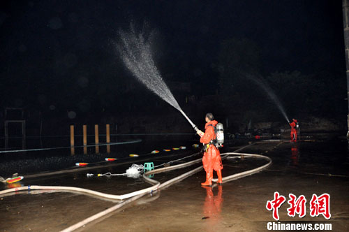 由于泄漏点还在不断发生氯气泄漏,浓浓的毒烟不断向周围蔓延,危险越来越严重,现场指挥部紧急商量应急对策,并紧急调集500多斤烧碱与其中和。参与现场警戒的公安民警根据现场情况不断扩大警戒范围。消防官兵身着防护服轮番深入泄漏区域,一边用开花水流稀释有毒气体,一边强行将氯气罐压在水中,使其中和。