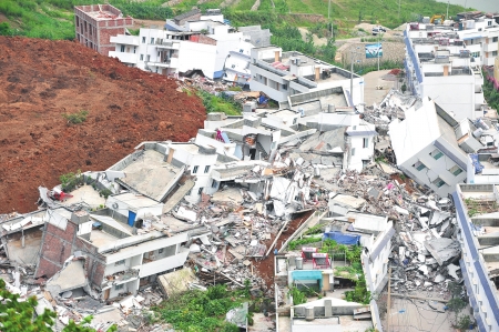 然而集镇背后,高耸的大山被生生拉了一条“伤痕”——灰色的土石从山腰倾泻而下,一直拉到集镇的边缘。土石经过的地方,所有的民房都被埋了进去。集镇上靠近山坡的房屋,也有许多未能幸免。或被埋、或倒塌、或倾斜,刚刚建起的新房成了废墟。经历过“5·12”特大地震的当地人说,这些房屋的样子和地震没什么两样。