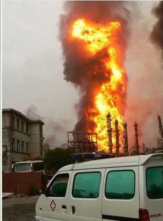 记者:现在我现在就在爆炸现场,爆炸的地点实际上是一个废弃的塑料化工厂,这个爆炸的原因是,有一条乙烯管道通过废弃的厂区,乙烯泄漏遇到明火发生爆炸。我看到路上一个小轿车已经烧的只剩车架了,周围的民房以及有一个红太阳家具城所有的门窗都已经被冲击波冲碎冲破了。