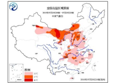 预计,明天白天,京津地区、河北大部、山西、陕西关中地区和东部、宁夏中北部、河南大部、山东中西部、安徽北部、湖北、四川盆地东部、重庆、贵州东北部、湖南大部、江西中北部、浙江大部、福建北部、海南北部等地有35℃以上的高温天气,局地最高气温可达37~38℃;内蒙古中西部、甘肃大部、新疆吐鲁番盆地及南疆盆地东部等地将有35~37℃的高温天气,局地最高气温可达40℃以上。