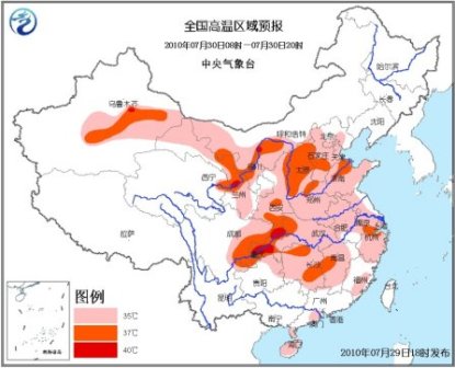 预计,明天白天,新疆吐鲁番盆地及南疆盆地东部、内蒙古西部偏南地区、甘肃大部、青海东北部、宁夏大部、陕西大部、华北大部、黄淮、江淮大部、江汉、江南大部、四川盆地、重庆、贵州东北部、海南大部等地有35~37℃的高温天气,其中,重庆、甘肃中部、吐鲁番盆地等地局部最高气温可达40℃以上。