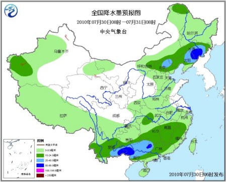 7月30日08时至31日08时,新疆西部、西藏中南部、内蒙古中东部、东北、华北北部、黄淮中南部、江淮、江汉大部、江南、华南以及川西高原南部、重庆东南部、云南、贵州等地有小到中雨或阵雨,其中,广西大部、云南东南部、江西南部、福建西南部、辽宁、吉林中东部、黑龙江西北部及新疆天山西部等地有大雨,部分地区暴雨;上述地区局部并伴有短时雷雨大风等强对流天气。新疆北部和东部、甘肃西北部、内蒙古东部、东北地区中北部等地有4~5级风。东海大部、台湾海峡、南海西北部和南部、北部湾有5~6级南到西南风。
