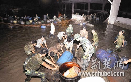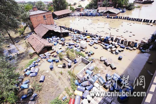 汉江长丰桥江段汉口一侧一仓库被淹,数百只化工铁桶和塑料桶浸泡在江水中,另有数千只桶堆在江中的平台上。昨日,记者闻讯立即向环保部门反映,东西湖区环保局连夜组织打捞。