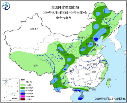 3日20时至4日20时,西藏大部、青海中东部和南部、西北地区中东部、内蒙古中东部、东北大部、华北、黄淮东部和北部、江苏南部、浙江东部、福建东部、广东南部、广西南部、海南、四川盆地西部、云南、台湾等地有小到中雨或阵雨,其中,内蒙古东北部和东部偏南地区、黑龙江西北部和中部偏南地区、吉林中西部、辽宁西部和中北部、河北东北部和中南部、天津、山东北部、四川盆地西部、甘肃南部、云南西部和南部、广西南部沿海、雷州半岛及海南等地有大雨,部分地区有暴雨,上述局地并伴有短时雷雨大风等强对流天气。