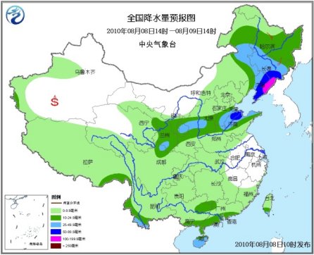 8日08时至9日08时,新疆天山地区和南疆西部、西藏大部、青海东北部和南部、西北地区中东部、内蒙古中东部、东北、华北、黄淮大部、江淮西部、江汉、江南中西部、华南大部、西南以及台湾等地有小到中雨或阵雨,其中,黑龙江南部、吉林大部、辽宁大部、河北中南部和东部、北京东部、天津、山东北部以及内蒙古东部的部分地区、海南大部、台湾南部等地有大雨或暴雨,吉林东南部、辽宁中东部等地的局地还将有大暴雨;上述部分地区并伴有短时雷雨大风等强对流天气。内蒙古中东部、东北西部等地有4~6级风。黄海、东海、台湾海峡将有5~8级风。