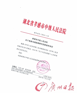 不过,冯缤还没有等到湖北省高院是否再审的裁定,却在7月底收到了自己的免职通知,他的助理审判员职务被孝感中院免除。
