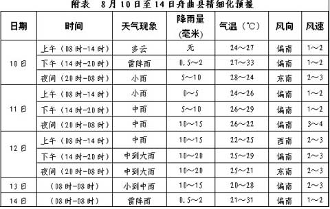 10日,舟曲县及白龙江流域上游阴天将有阵雨或雷阵雨,降雨量有5~15毫米。