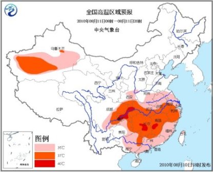 中新网8月10日电 据中央气象台预计,今天夜间到明天白天,华北地区仍是降雨的重点区域,河北、山西局地将有大暴雨;同时,南方地区高温持续,其中 四川盆地东南部、重庆大部、湖南中南部、江西中部等地气温可达38~39℃,部分地区气温可达40℃以上。