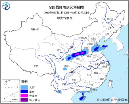 中新网8月11日电 据中央气象台消息,中央气象台8月11日18时继续发布暴雨蓝色预警:8月11日20时到8月12日20时,甘肃南部和东部、陕西中部、山西中南部、河北南部、山东中北部、四川盆地西部、广西南部、广东西南部、海南、云南南部等地的部分地区有大雨或暴雨,其中,甘肃东部、陕西中部、山西西南部等地的局部地区有大暴雨;上述地区局地并伴有短时雷雨大风等强对流天气。