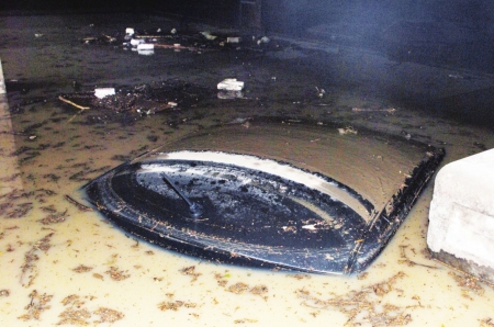 昨日凌晨1点过,还在睡梦中的张先生被窗外的雷鸣声惊醒,接着他听到楼下传来喊叫,“车库被淹了,快把外面的车开走。”张先生猛地从床上爬起来,火急火燎地跑向车库时,发现雨下不够半小时,车库的积水已经涨到3米深,里面的7辆汽车全部被淹没顶。直到昨日下午7时,车库内的淤泥还未被清理干净。 (记者 薛小龙 摄影 吕甲 实习生 周烜)