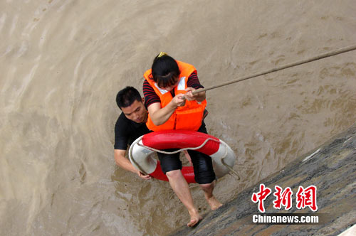 消防官兵搜寻到中摊堡大道,听到中普建设枫香树村安置房与中摊堡安置房交界处传来求救声音,利用强光手电筒发现:洪水已将4名来不及疏散的施工人员团团包围,工人在楼顶挥手、呼喊求救。“不要着急,我们马上想办法过来救你们”。由于水流很急且到处都是施工队挖的暗沟,时间紧迫,消防站余柯政站长来不及多考虑,立即下令,将保险绳拴在消防车上,余站长和刘飞穿上救生衣,绑好安全绳后,带着救生圈慢慢的游到被困群众位置,将救生衣为民工穿好后,一边由消防官兵护送一边由在消防车一边的其余消防官兵牵引安全绳接应,紧急转移被困群众。一趟、两趟、三趟……经过近半小时的奋战,成功救出被困工人。