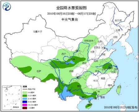 16日20时至17日20时,西藏大部、青海南部和东部、西北地区东部、内蒙古中部、华北西北部、湖北大部、湖南西北部、河南中南部、安徽、江苏、上海、浙江北部、华南大部、西南地区大部等地有小到中雨或阵雨,其中,青海东南部、甘肃东南部、四川北部、广东西南部、广西南部、云南中部和南部等地有大雨或暴雨;上述局部地区并伴有短时雷雨大风等强对流天气。新疆南疆盆地的部分地区有扬沙或浮尘天气。渤海、黄海北部和中部海域将有4~5级西南转西北风;东海大部海域将有4~6级西南风;台湾以东海域、南海大部海域将有4~5级偏南风。