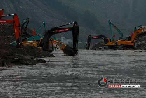 随着入口扩大,抢险队伍同时在岷江右岸(改道后的河道)铺设了一条150米长的进站道,以利重型机械通过,并准备在明后天对改道后的岷江河道进行截流。
