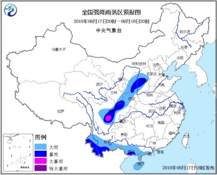中新网8月17日电 据中央气象台消息,中央气象台8月17日18时继续发布暴雨蓝色预警:8月17日20时到8月18日20时,四川盆地西部、川西高原东部、甘肃东部和南部、陕西中北部和西南部、山西中部和西部、云南西部和南部、广西中南部、广东西南部、海南等地有大雨或暴雨,其中四川盆地西南部的局地有大暴雨;上述局部地区并伴有短时雷雨大风等强对流天气。