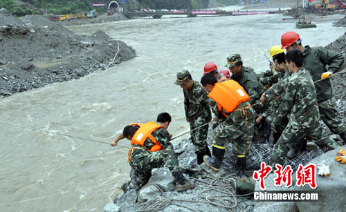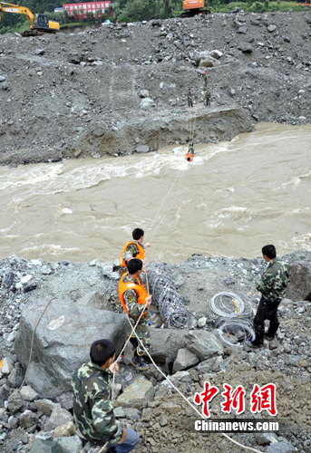 中新网映秀8月18日电(郭永全 张浪 鄢银婵)18日早6点,汶川消防大队映秀消防站接到武警水电部队求助电话,在位于映秀镇堰塞湖处处理淤泥沙石拓宽河道的数十名机械工人因河道加宽,水流湍急,无法从原来搭设的绳桥往返对岸进行作业。