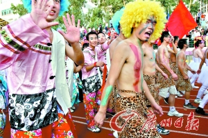 昨日下午5时许,富士康龙华厂区D区,在彩车指引下,一个个由富士康员工组成的系列方阵开始巡游。由于是下班时间,活动吸引了众多员工驻足观看。参加巡游的员工们穿上各具特色的衣服,不同事业群的员工彰显出不同的个性。某事业群的员工小陈穿着一身“江南才子”的服装在音乐下与同事一起跳舞,虽然已经全身是汗,但是他觉得非常放松和快乐。“这就像国外的狂欢节一样,参与到其中就会感到很快乐。”