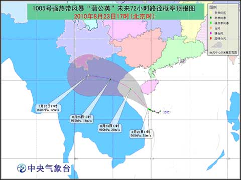 受其影响,23日晚上到24日白天,南海西部海面、琼州海峡、北部湾海面及海南沿海、广东中西部沿海和广西沿海将有7-9级大风,“蒲公英”中心经过的附近海面和地区的风力有10级,阵风可达11-12级;海南、广东西南部、广西南部有大到暴雨,其中海南南部的部分地区有大暴雨。