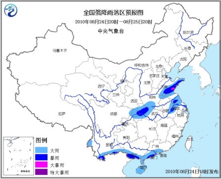 中新网8月24日电 据中央气象台报道,中央气象台8月24日18时继续发布暴雨蓝色预警:8月24日20时到25日20时,重庆东北部、湖北中西部、河南西南部、山东东部和南部、江苏、安徽东部、广东南部、海南、广西南部、云南南部和西部等地的部分地区有大雨或暴雨,其中,山东南部局地有大暴雨;上述地区局部并伴有短时雷雨大风等强对流天气。