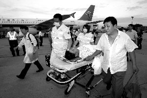 昨日下午5时许,北京急救中心安排了12辆车,到首都机场转运伤员及随行家属。下午6时15分许,搭载有10名伤员的海航A320包机,降落在首都机场南停机坪。