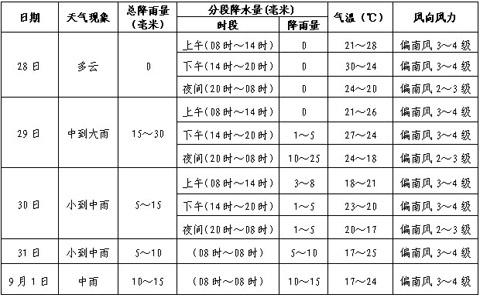 8月28日至9月1日舟曲县精细化天气预报如下表: