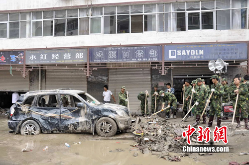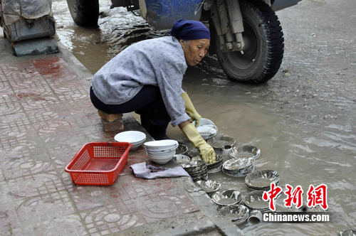 舟曲县城里的商铺陆续开始营业,大灾中幸存的老人戴着手套清理埋在淤泥中的碗碟,生活的气息越来越浓。