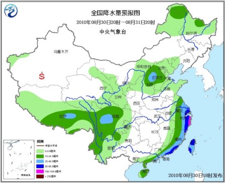 30日20时至31日20时,新疆南疆西部、西藏大部、青海东部和南部、西北地区中东部、内蒙古中西部和东北部、黑龙江大部、辽宁西部、华北大部、黄淮东部、江淮东部、江南东部、华南东部和南部、四川大部、重庆西部、贵州西北部、云南大部等地有小到中雨或阵雨,其中,川西高原中部、山西东北部、江苏东南部、上海、浙江中东部、福建东部沿海、广东东部沿海、台湾等地有大雨或暴雨;浙江东部的局部地区有大暴雨;上述部分地区并伴有短时雷雨大风等强对流天气。新疆南疆盆地南部的部分地区有扬沙或浮尘天气,新疆南部、内蒙古东部、东北北部等地有4~5级风。受“狮子山”和第8号热带风暴的共同影响,东海南部海域、南海北部海域、台湾海峡、台湾以东洋面的风力将有6~8级,阵风可达9~10级,其中南海北部部分海域的风力将有9~11级,阵风可达11~12级。