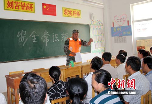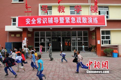 中新网舟曲9月1日电 (刘鹏)1日下午,是甘肃舟曲灾区新学期开学的日子,兰州军区某集团军舟桥团的教官们采取理论辅导、观看示意图、动作练习、模拟演练等方式,对舟曲城关小学600多师生展开了一场紧急避险演练培训。演练培训包括火灾、洪灾、地震、泥石流等灾害发生时怎样避险、逃生等。
