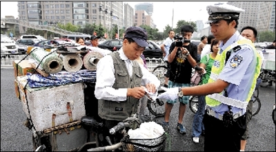 昨天上午9点,记者在东单路口看到,8名民警“把守”在路口4个方向,由于正值上班高峰,路口骑车人较多,大部分人能等待红灯,几名想“闯关”的骑车人被民警和协管员拦住。市民小陈骑电动自行车载人,被执勤民警拦下并处以罚款20元。记者注意到,民警处理的多是自己加装动力装置的三轮车。“自行加装动力装置很危险。”民警说,行人、非机动车的违法行为主要有骑车带人、逆行、闯红灯等。昨天上午两个小时内,仅东单路口一处,民警就处罚了20多起行人、非机动车的违法行为。