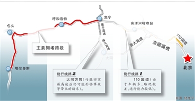 连日来,受大货超载、车多、修路等因素影响,京藏高速重现大拥堵,上万车辆滞留,内蒙古境内堵车路段更是长达120公里。与京外情况相比,110国道西关环岛至延庆段的进京和出京方向交通都较为通畅,未现拥堵现象。