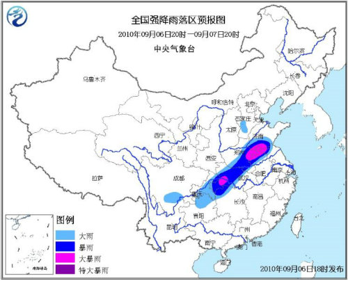 中新网9月7日电 据中国气象局网站报道,6日,中国黄河流域到长江流域之间的大部分地区出现明显降雨天气。预计,6日夜间到7日白天,河南、安徽、江苏及湖北局地将有大暴雨。