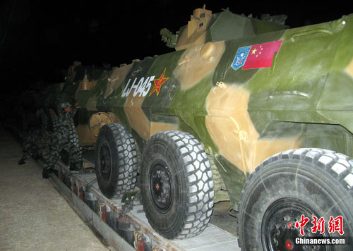 中新社奥塔尔9月7日电 (记者 孙自法)当地时间9月7日凌晨5时10分,中国人民解放军参加“和平使命-2010”上海合作组织联合反恐军事演习陆军战斗群第一列车梯队参演官兵及装备,顺利抵达临近演习现地的哈萨克斯坦奥塔尔市火车站。